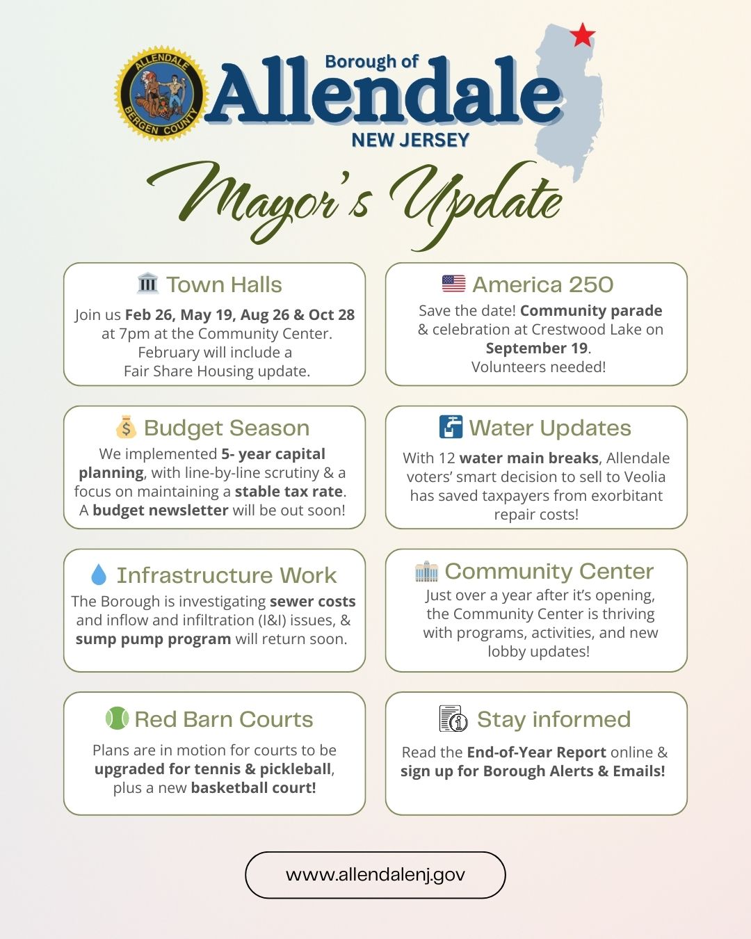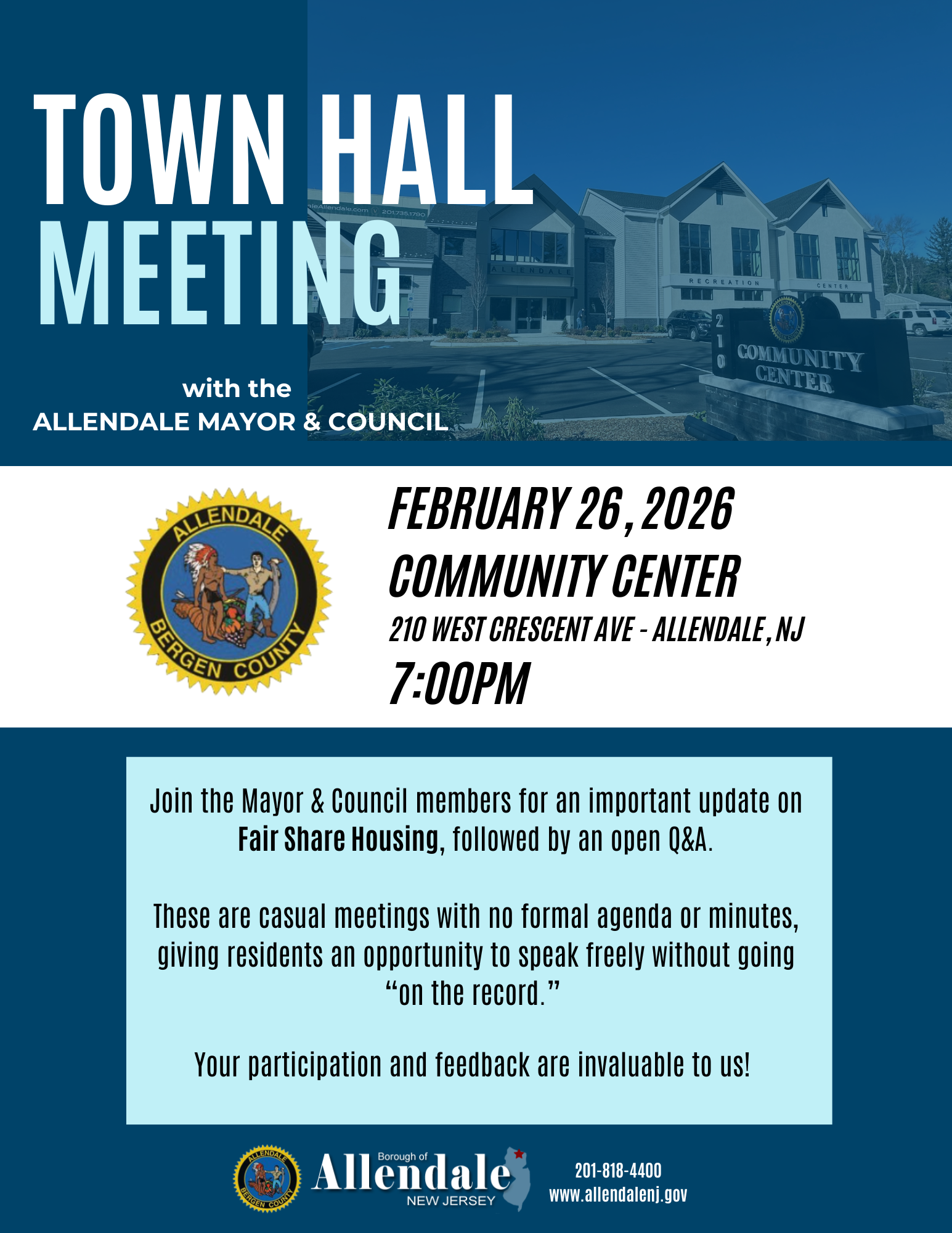 The February 19, 2026 meeting of the Mayor and Council of the Borough of Allendale will be held in-person at the Allendale Municipal Building, 500 West Crescent Avenue, Allendale, New Jersey 07401. The Work Session will begin at 7:00 p.m., immediately followed by the Regular Session in the Council Chambers located on the second floor. The Borough of Allendale will also livestream the Work and Regular Sessions. Join Live