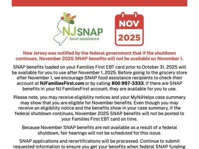 Governor Phil Murphy declared that New Jersey will enter a State of Emergency effective at 12:00 a.m. on November 1, 2025 due to the suspension of federal Supplemental Nutrition Assistance Program (SNAP) benefits. See press release and list of food pantries.