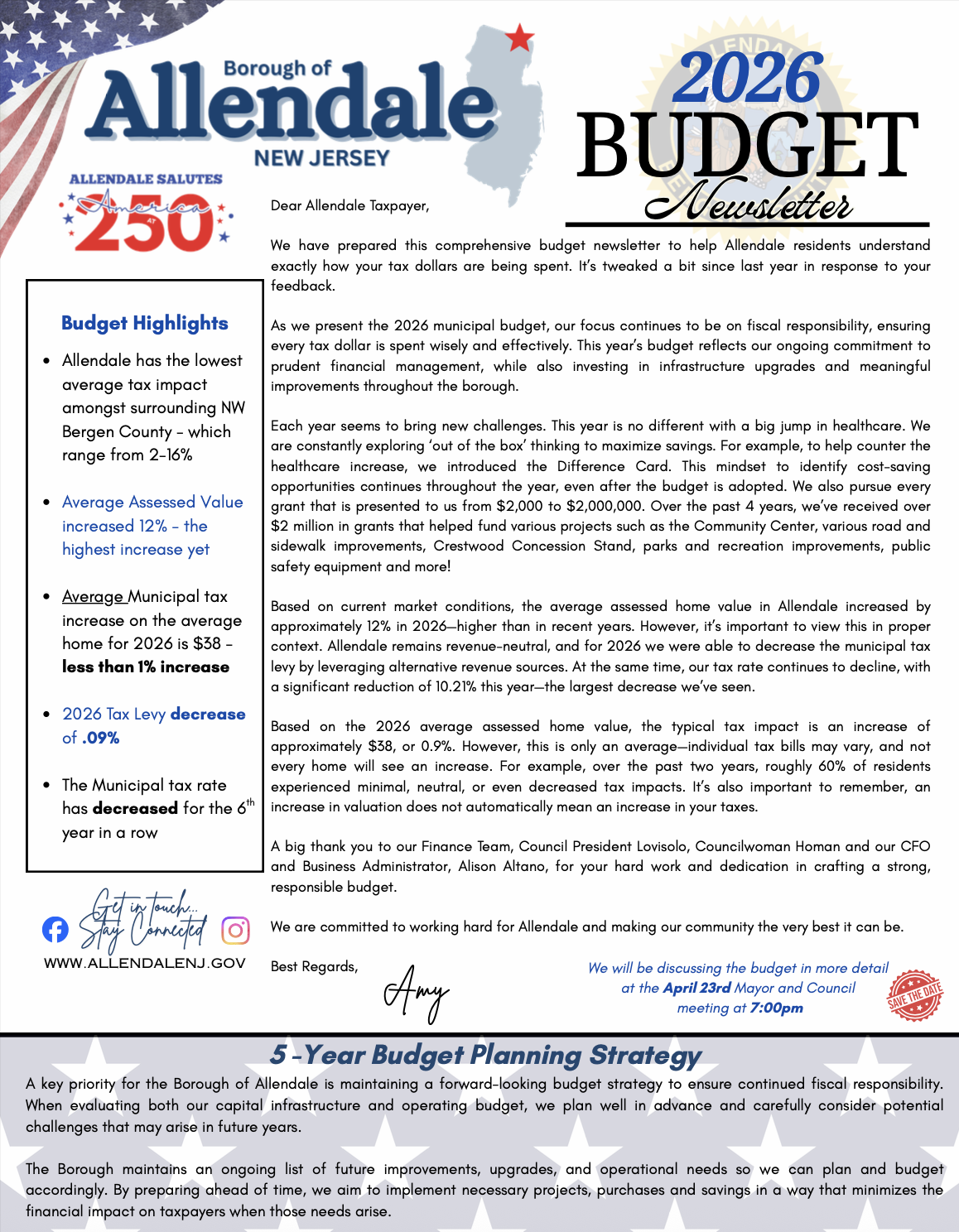 As we present the 2026 municipal budget, our focus continues to be on fiscal responsibility, ensuring every tax dollar is spent wisely and effectively. This year’s budget reflects our ongoing commitment toprudent financial management, while also investing in infrastructure upgrades and meaningful improvements throughout the borough.