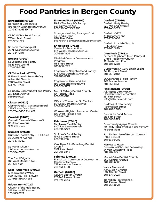 The Governor encourages New Jerseyans to visit nj211.org for statewide emergency resources. This situation continues to change, so SNAP food assistance recipients should check their accounts at NJFamiliesFirst.com; call 800-997-3333; and visit njsnap.gov for updates on the status of their SNAP benefits. A number of pantries offer fresh produce in addition to stable, non-perishable foods, shopping appointments, and information about additional services. Residents are encouraged to locate food pantries and community kitchens via NJ 211 here.