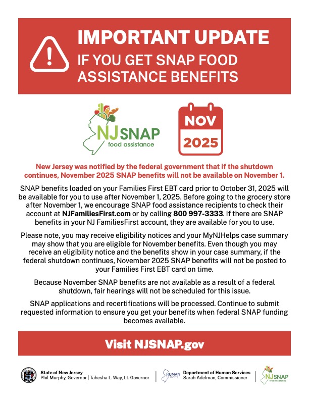 “With more than 800,000 New Jerseyans relying on SNAP to put food on the table, the Trump Administration’s decision to suspend benefits has created a clear and present threat to the health and safety of our residents,” said Governor Murphy. “We will not stand by while families face hunger. That is why our state will mobilize every available resource to strengthen our food access networks banks, protect vulnerable communities, and ensure that every resident has access to the meals they need.”