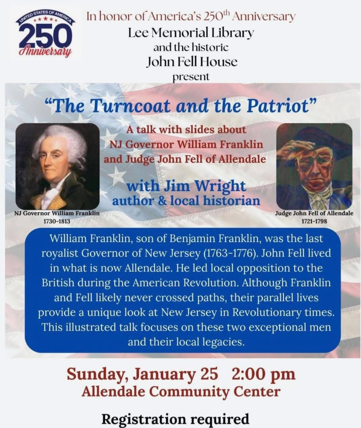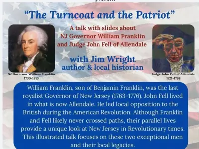 Join Jim Wright for a talk with slides about two of Allendale's notable Revolutionary War figures: NJ Governor Will Franklin (Benjamin Franklin's son - and a Loyalist!) and Judge John Fell.