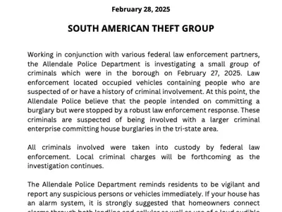 Working in conjunction with various federal law enforcement partners, the Allendale Police Department is investigating a small group of criminals which were in the borough on February 27, 2025. Law enforcement located occupied vehicles containing people who are suspected of or have a history of criminal involvement. At this point, the Allendale Police believe that the people intended on committing a burglary but were stopped by a robust law enforcement response. These criminals are suspected of being involved with a larger criminal enterprise committing house burglaries in the tri-state area.