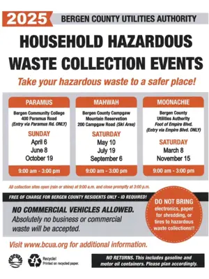 The disposal of this material is conducted by the Bergen County Utilities Authority during Special Events throughout the year at three locations. Safe and free collections are for all Bergen County residents, that being said, proof of residency is required. No materials from businesses will be accepted.