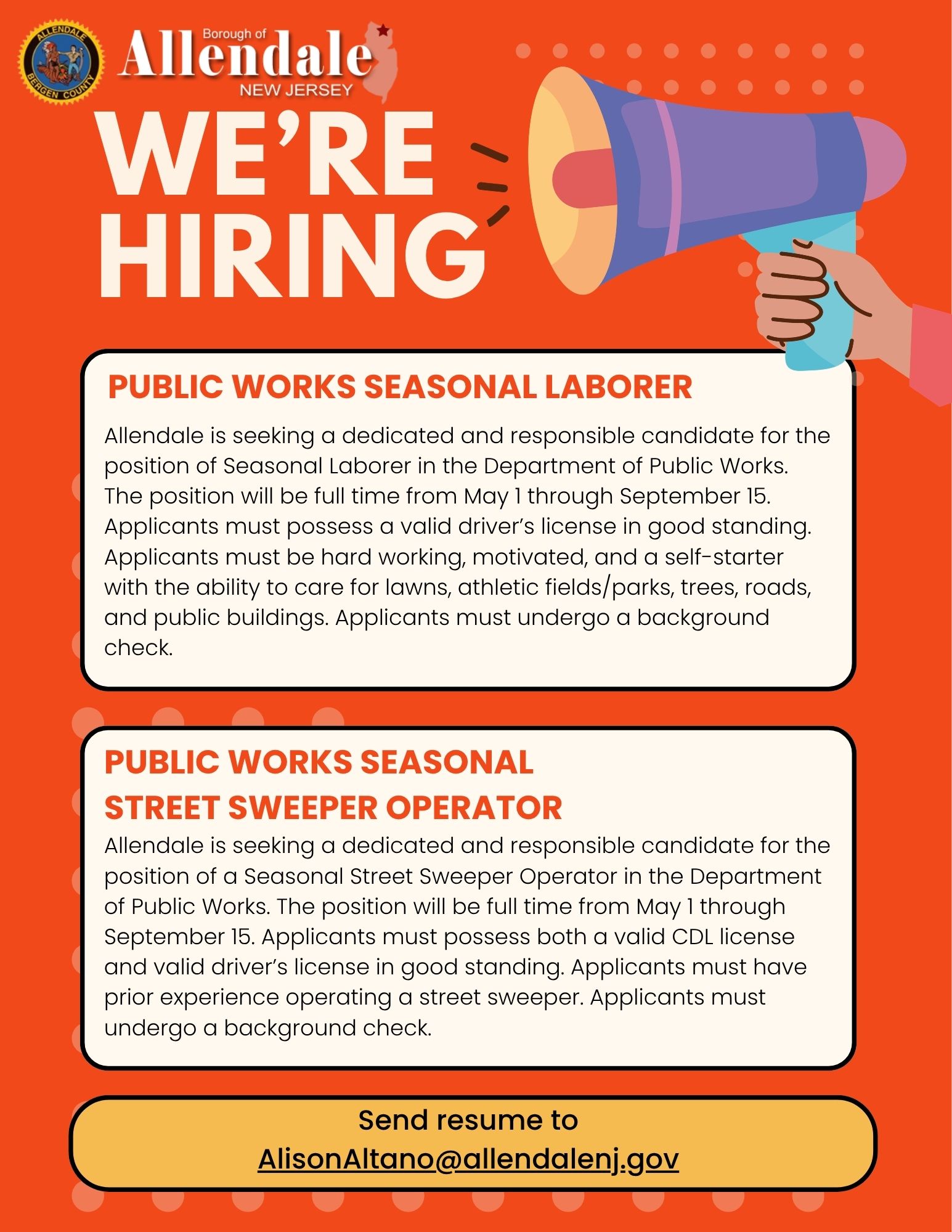 Interested candidates can send their resume to Alison Altano, Borough Administrator at alisonaltano@allendalenj.gov